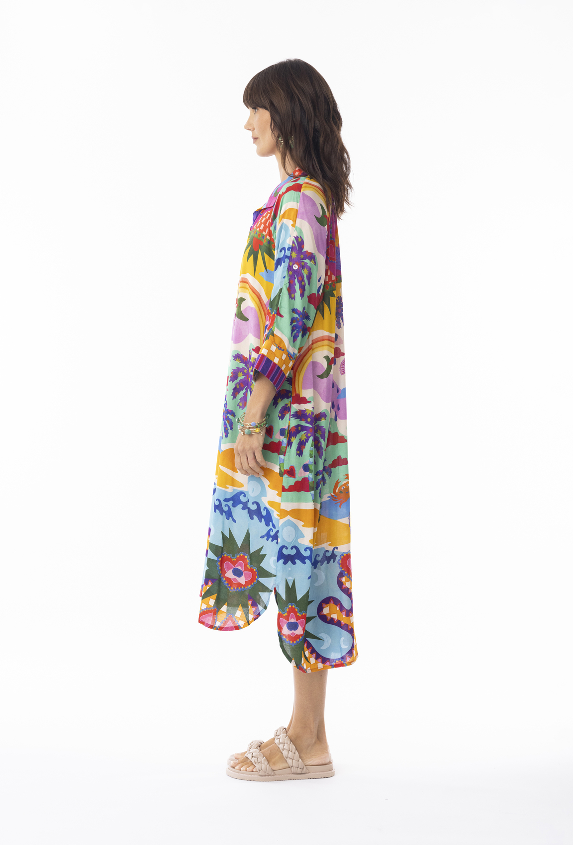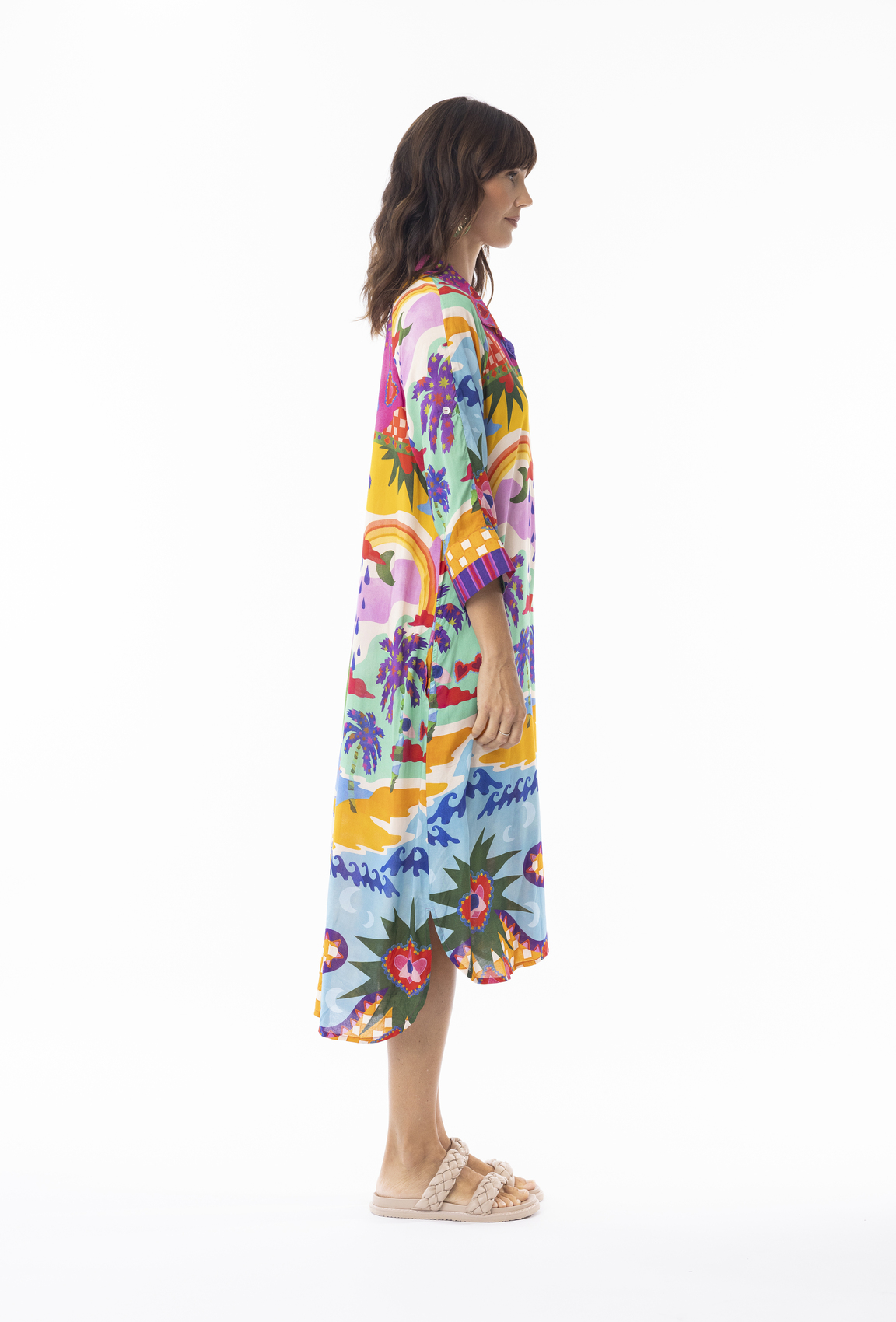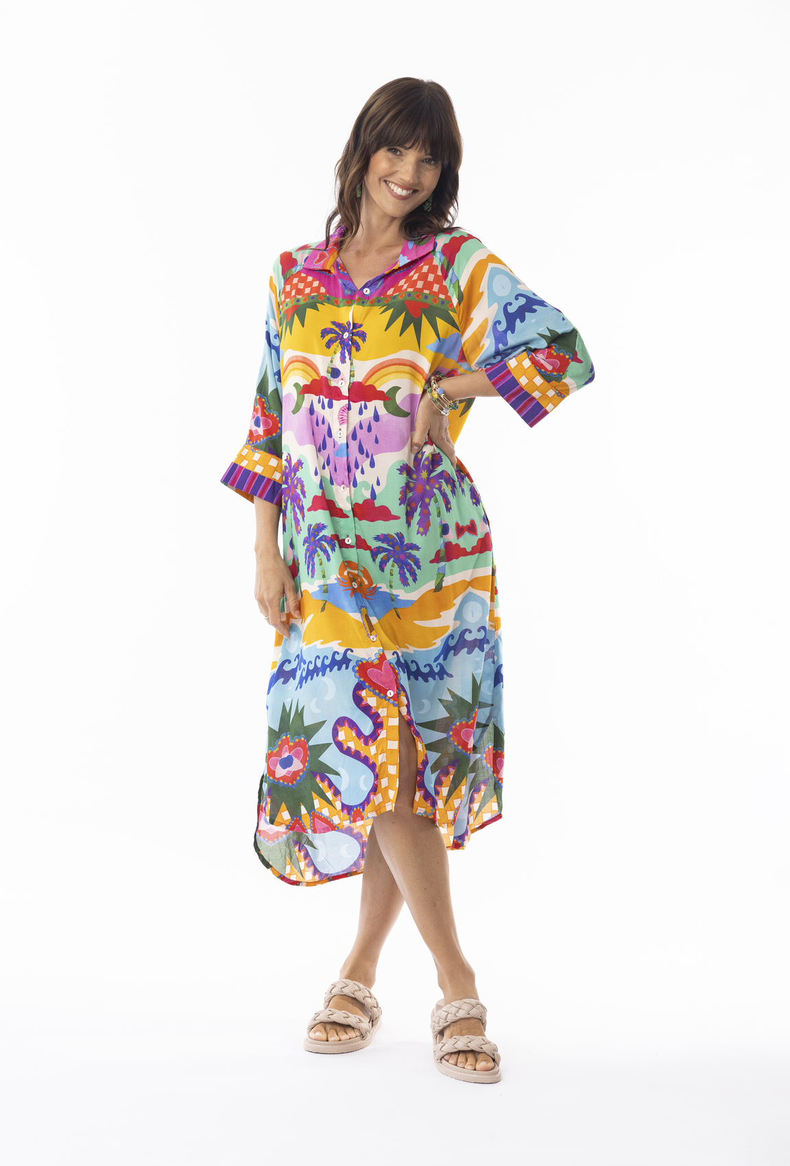 Answer the call of adventure in the soul-stirring Briana Shirt Dress. With a whimsical print that exudes love of the beachside, it is crafted from breathable linen, this versatile piece features fun prints, vibrant colour, a crisp collar, full-length button placket, and practical side pockets. Perfect for any occasion, it transitions seamlessly from day to evening, ensuring you look effortlessly chic wherever you go.