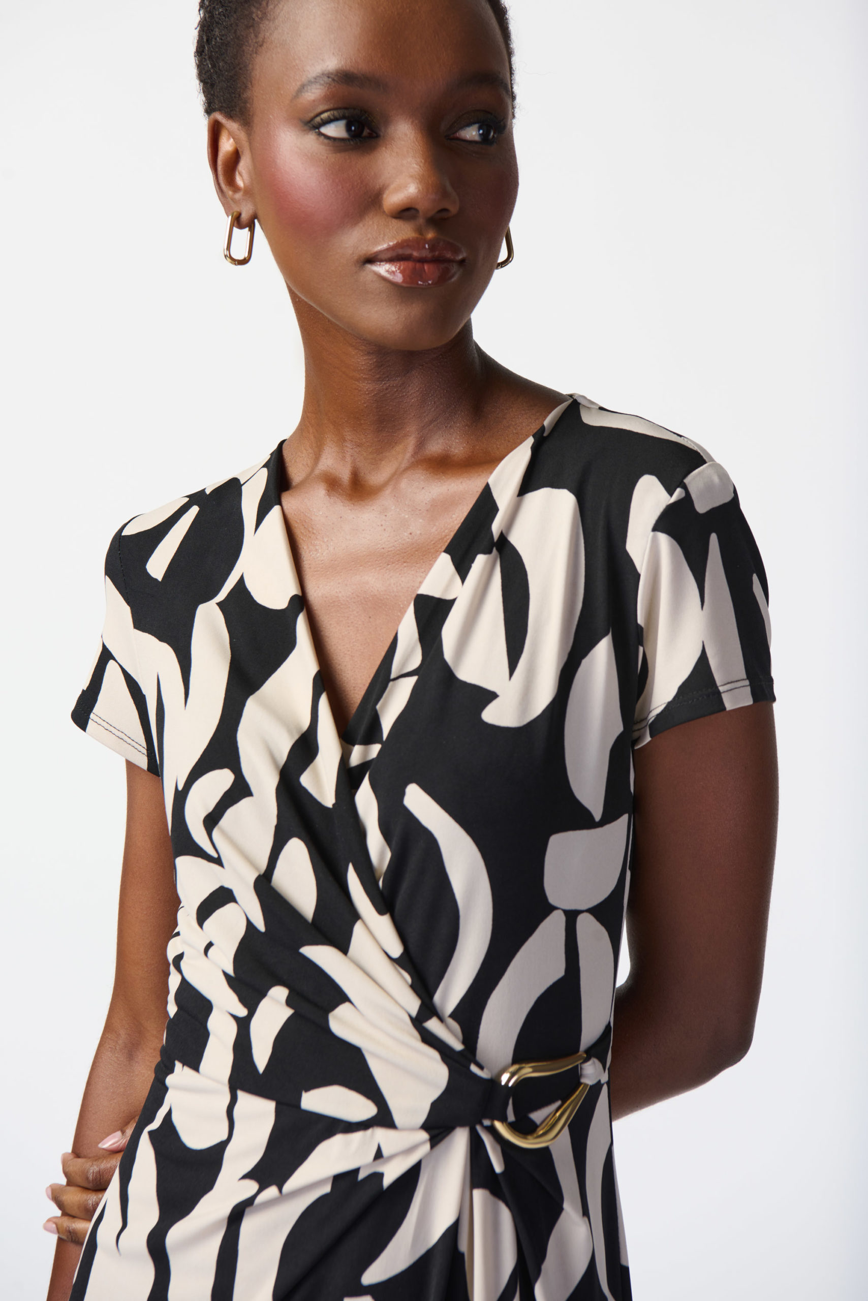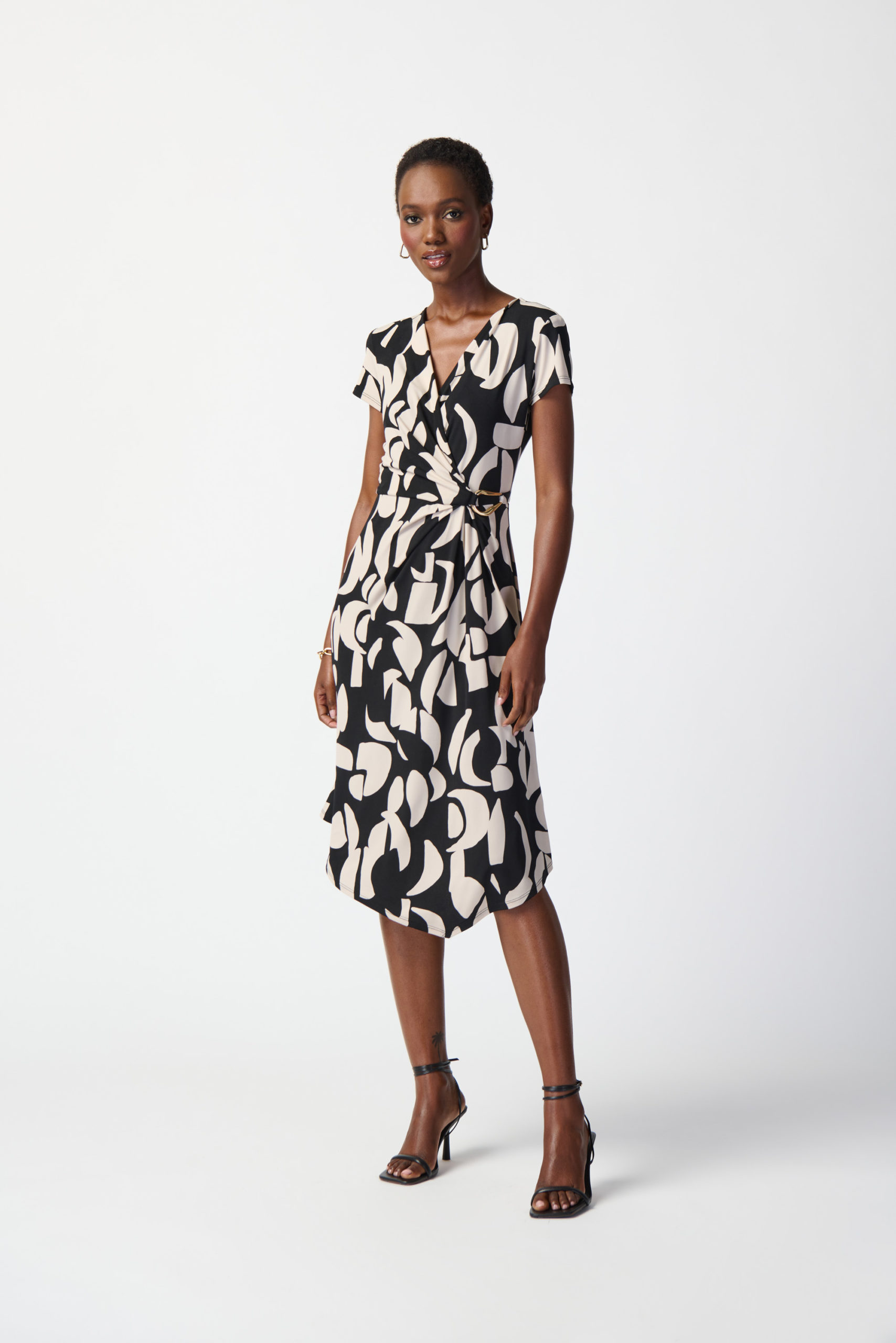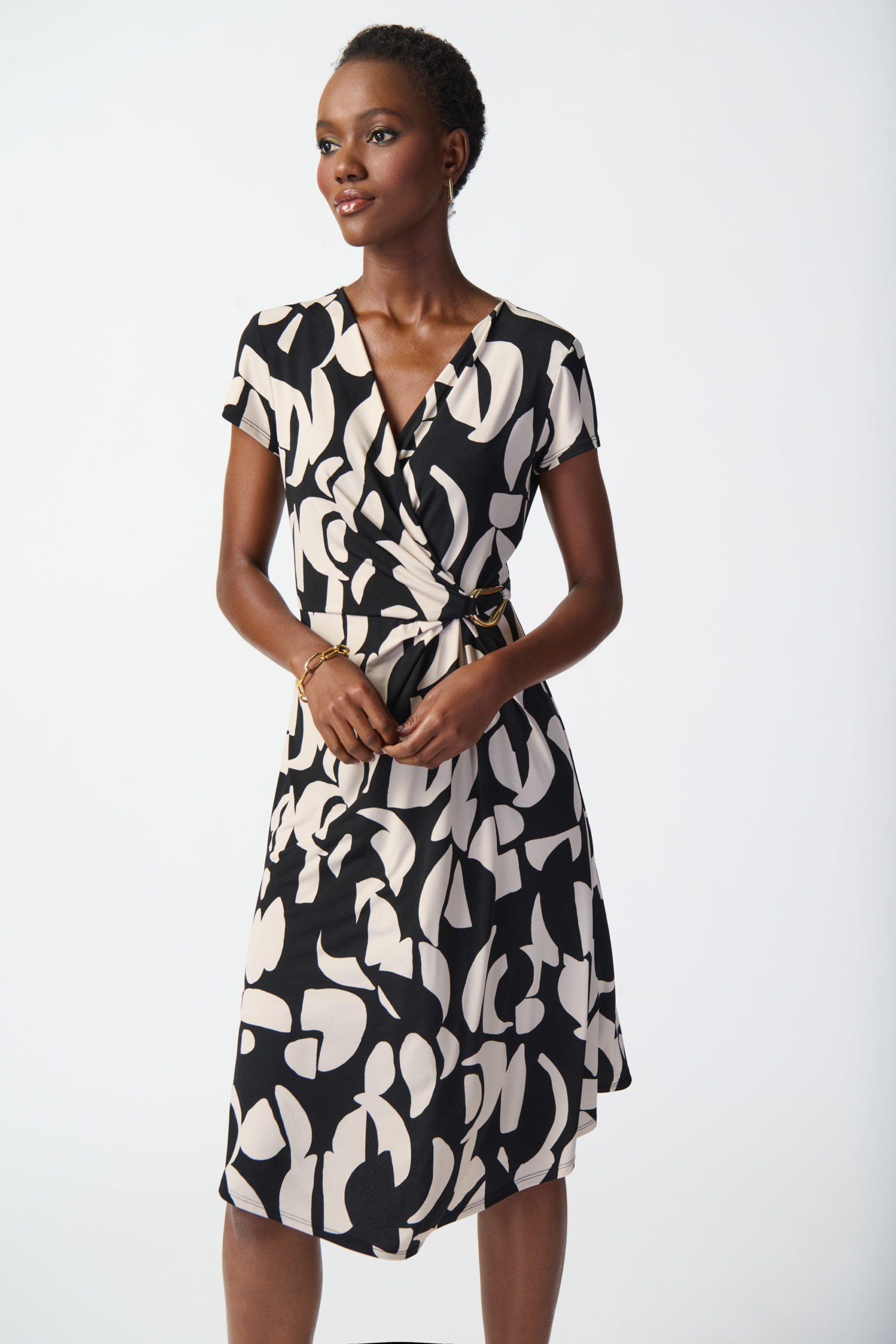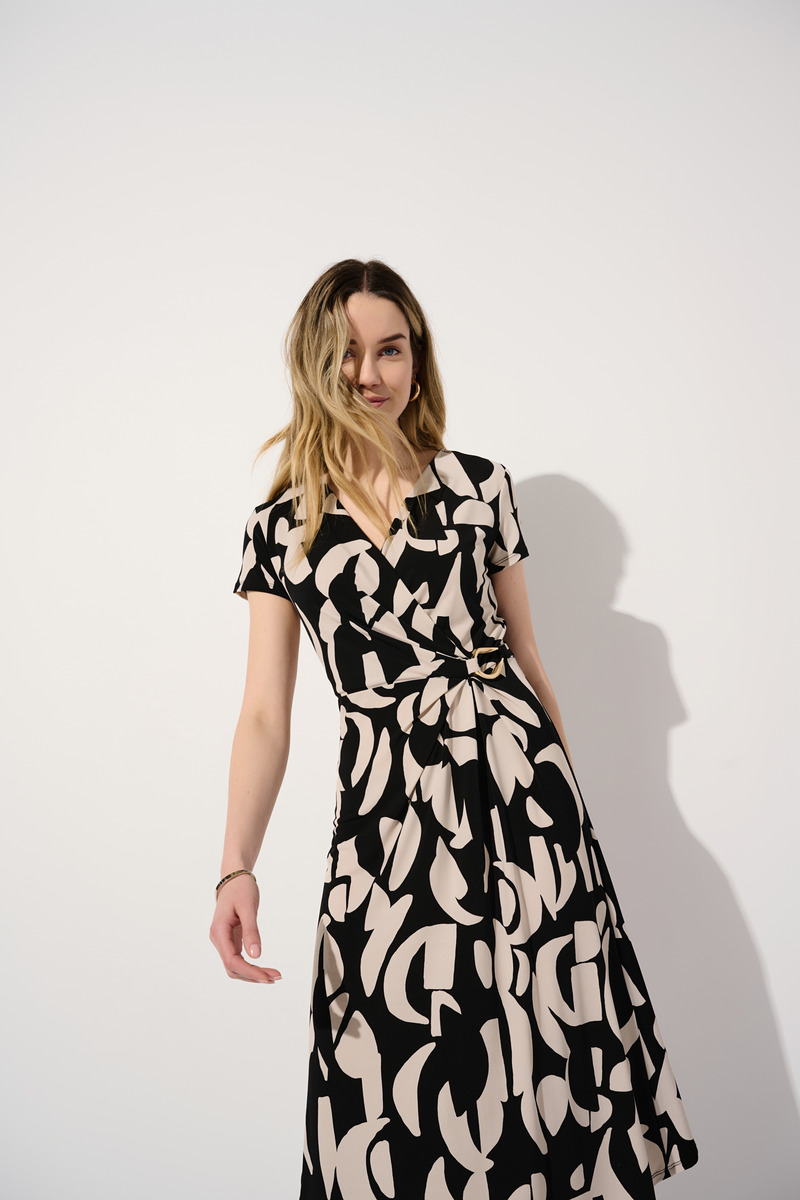 Adorned with a mesmerizing abstract design, this print knit dress is tailored in a flattering fit and flare silhouette. Its sleek wrap neckline paired with cap short sleeves enhance the garment’s feminine feel. Falling below the knee, this piece is accentuated by an asymmetric hemline adding grace to every movement.