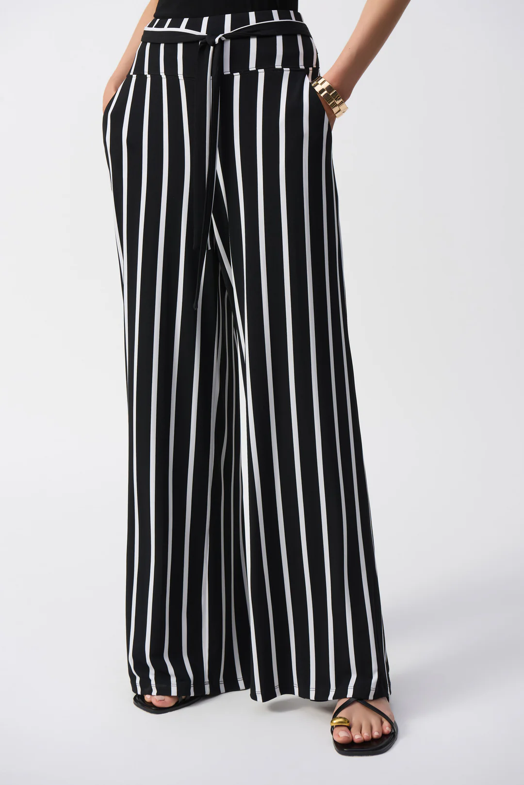 These wide-leg pants will add instant flair to any attire. Their sleek stripes, emblems of timeless fashion, adorn the garment’s silky knit fabric. The wide waistband and chic sash pair style and function to perfection and complete the pant’s poised look.