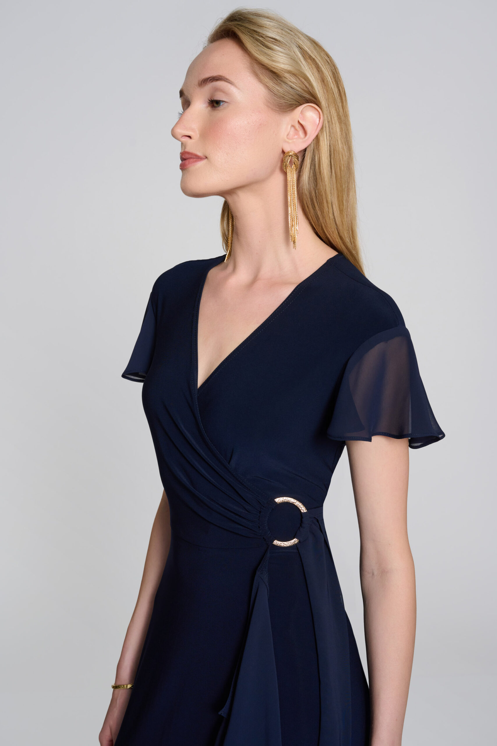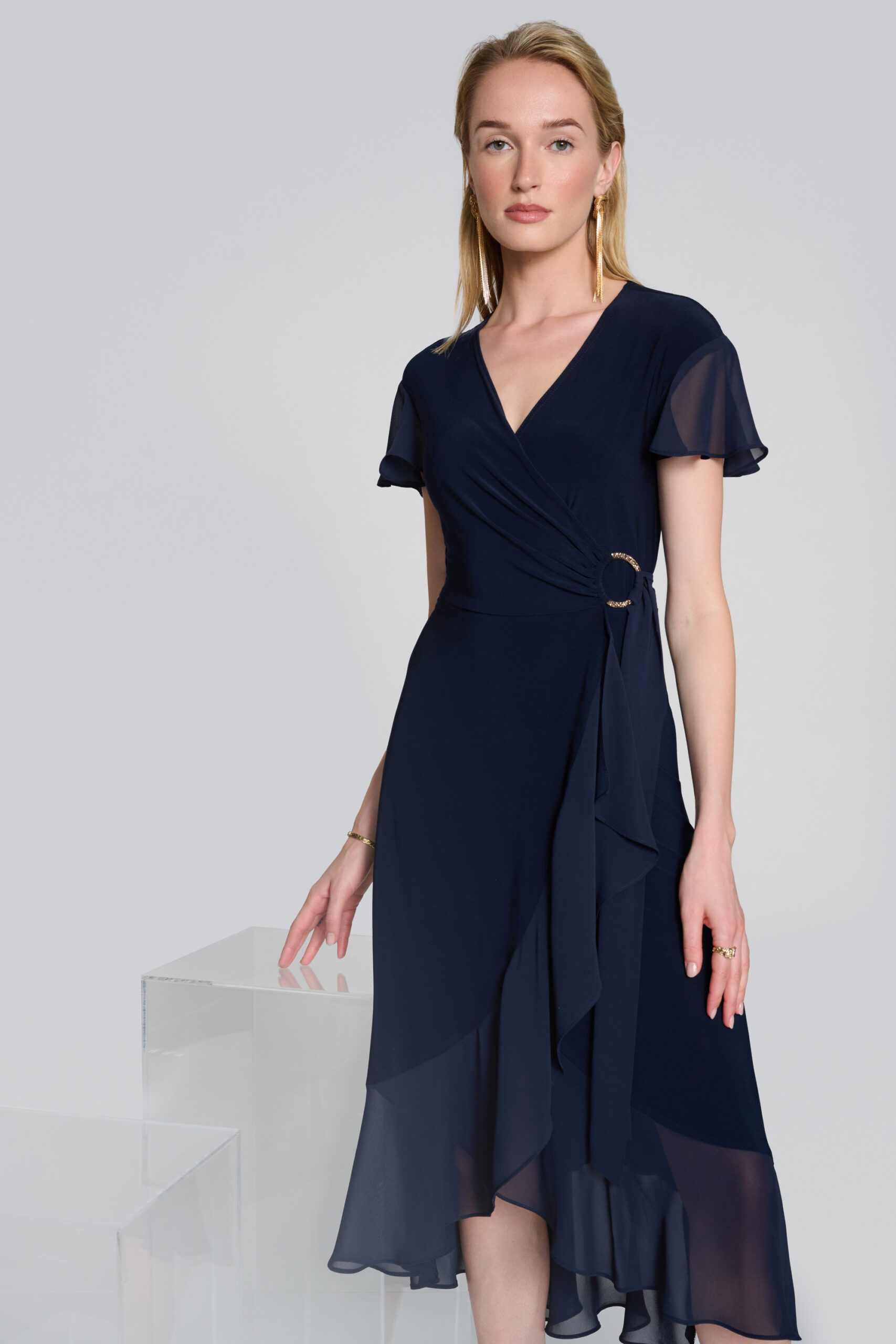 Joseph Ribkoff Signature Collection. Experience effortless grace in a silky knit and chiffon flowy wrap dress. Side buckles and a sash accentuate the waist while short ruffled sleeves and a high-low hemline add playful elegance. With a below-the-knee length, this unlined marvel defines chic comfort and timeless style.