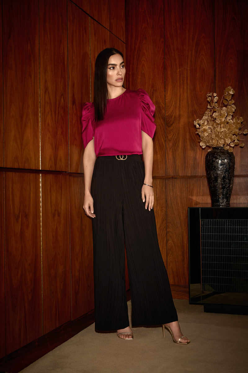 A pleated design and wide-leg silhouette add relaxed elegance to these silky knit pants. The sash and buckle on the elastic waistband ensure a perfect fit and a refined aesthetic.
