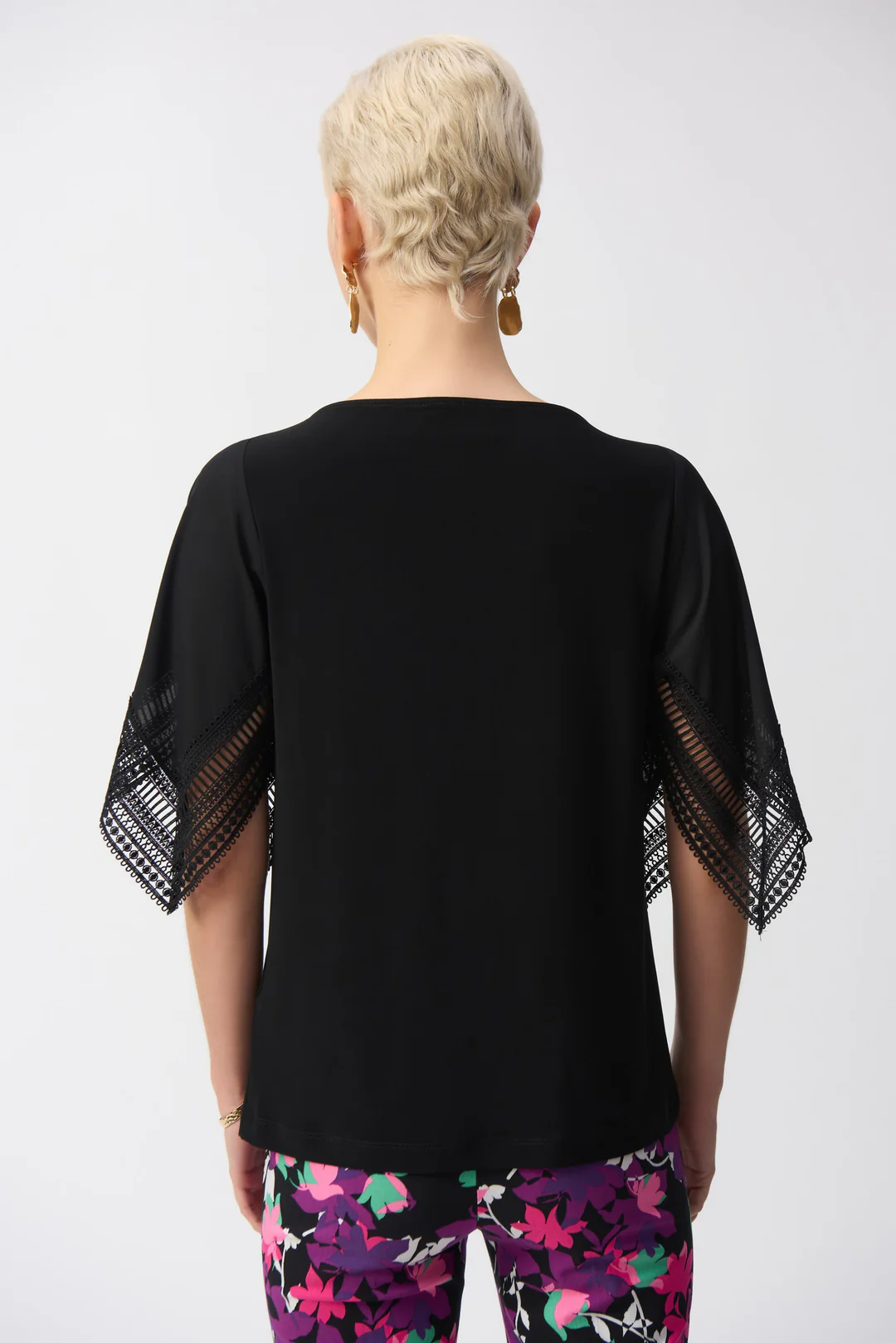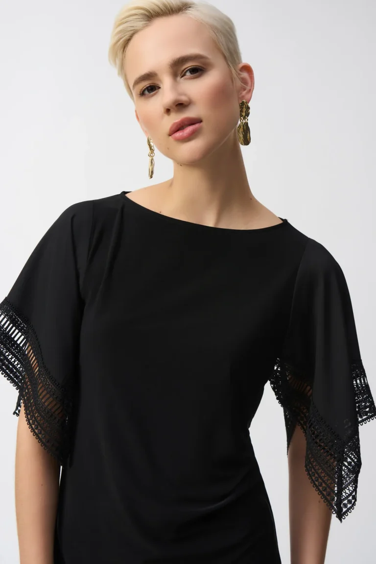 This remarkable silky knit top is perfect for any occasion. The three-quarter handkerchief sleeves, tailored in georgette fabric with delicate guipure at the hem, bring an airy feel to this contemporary design. The boat neckline adds finesse to the look and elevates the garment’s classic straight silhouette.