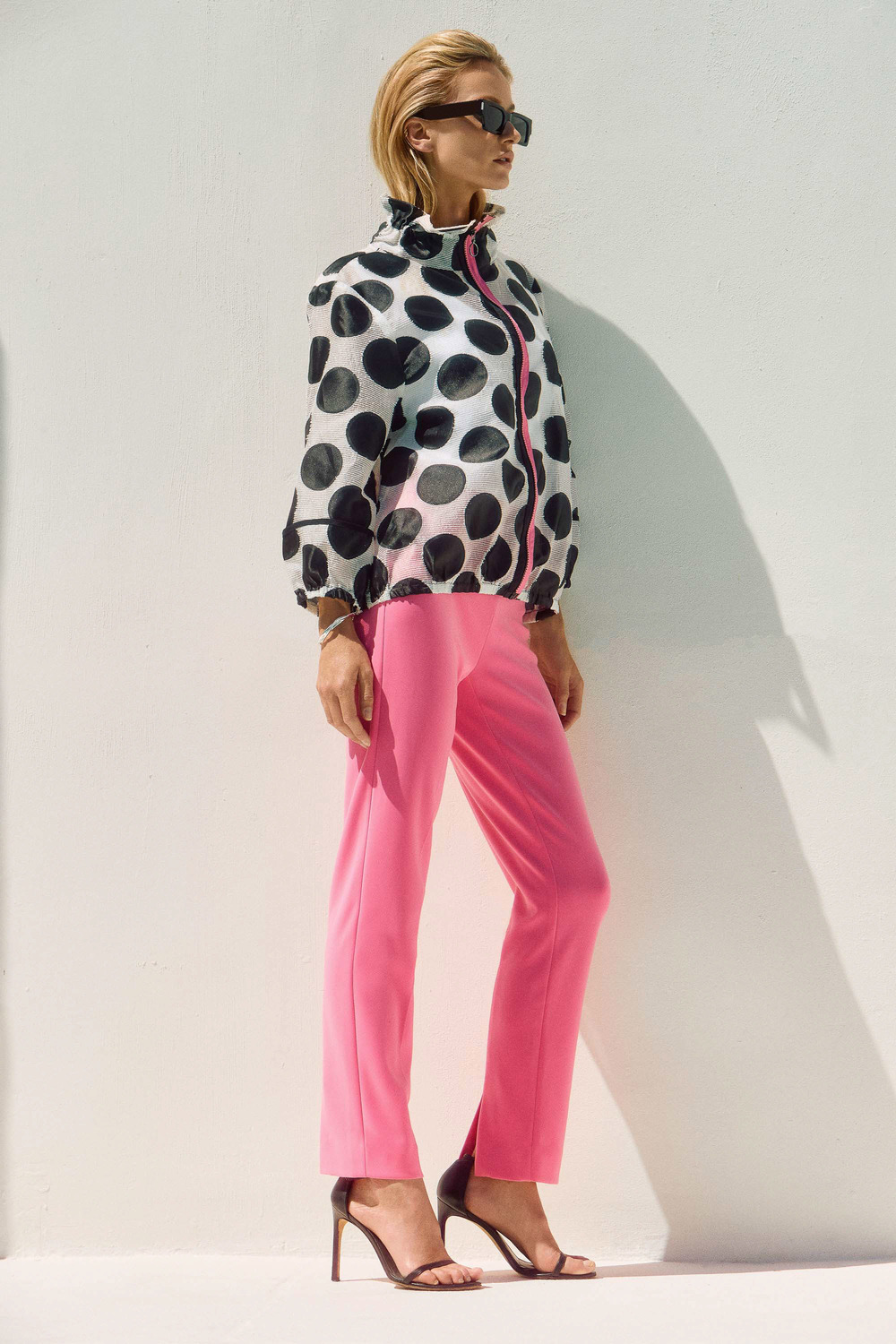 An exquisite display of artistic flair, this novelty jacquard jacket infuses instant style in any ensemble. The garment flaunts a striking dot print on a boxy silhouette that exudes bold confidence. The three-quarter puffed sleeves, shirred collar and front colour-blocked zipper closure work together beautifully to create this stunning piece.