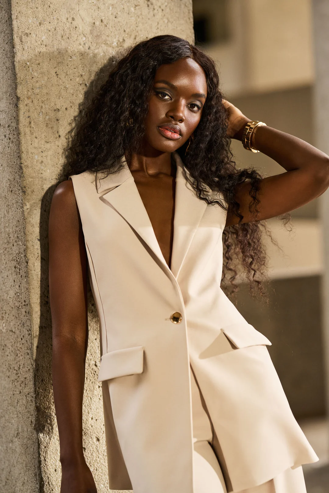 Revamp your workwear with this fitted sleeveless vest, crafted from a luxurious twill fabric. Tailored to perfection with a notched collar, front darts, and back princess seams, this piece will hug you just right. A single button closure and faux-pocket flaps add to its sophisticated style. Complete the look with matching trousers style 251265