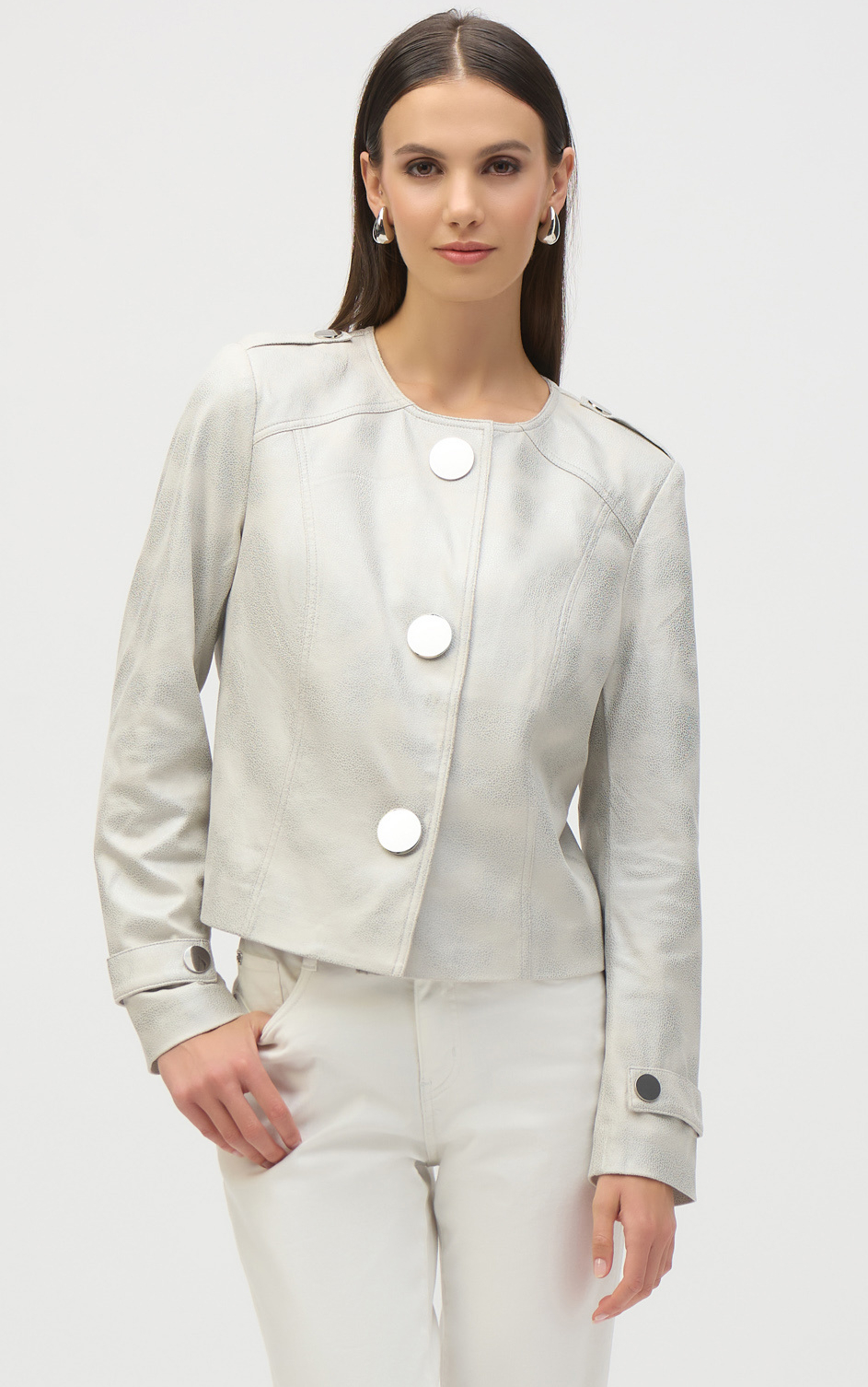 Add a sophisticated touch to any outfit with this sensational collarless jacket, cut from a stretch foiled faux suede. Detailed with tabs at the shoulder and sleeves, this trendy piece is further refined with large metal snap buttons.
