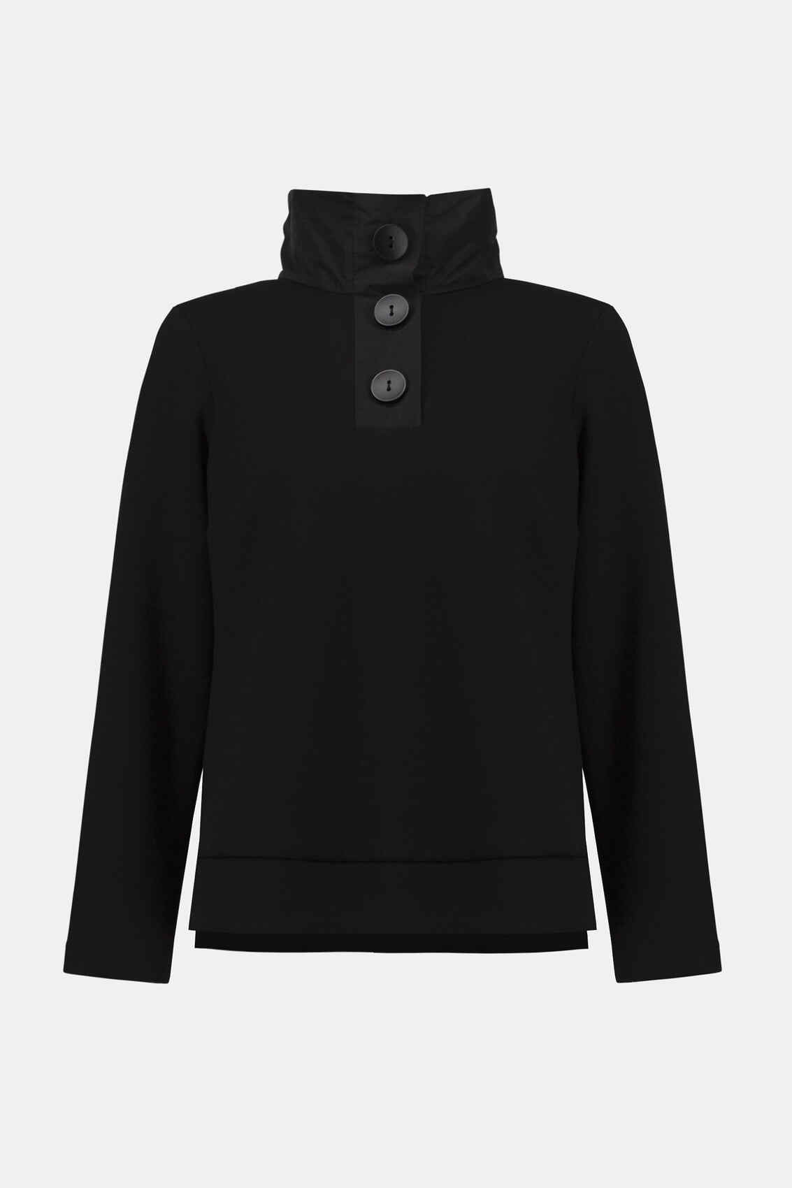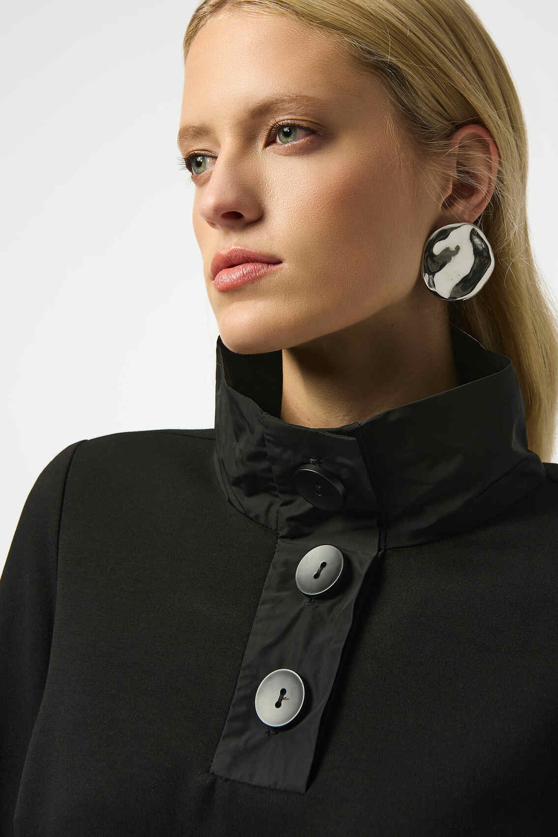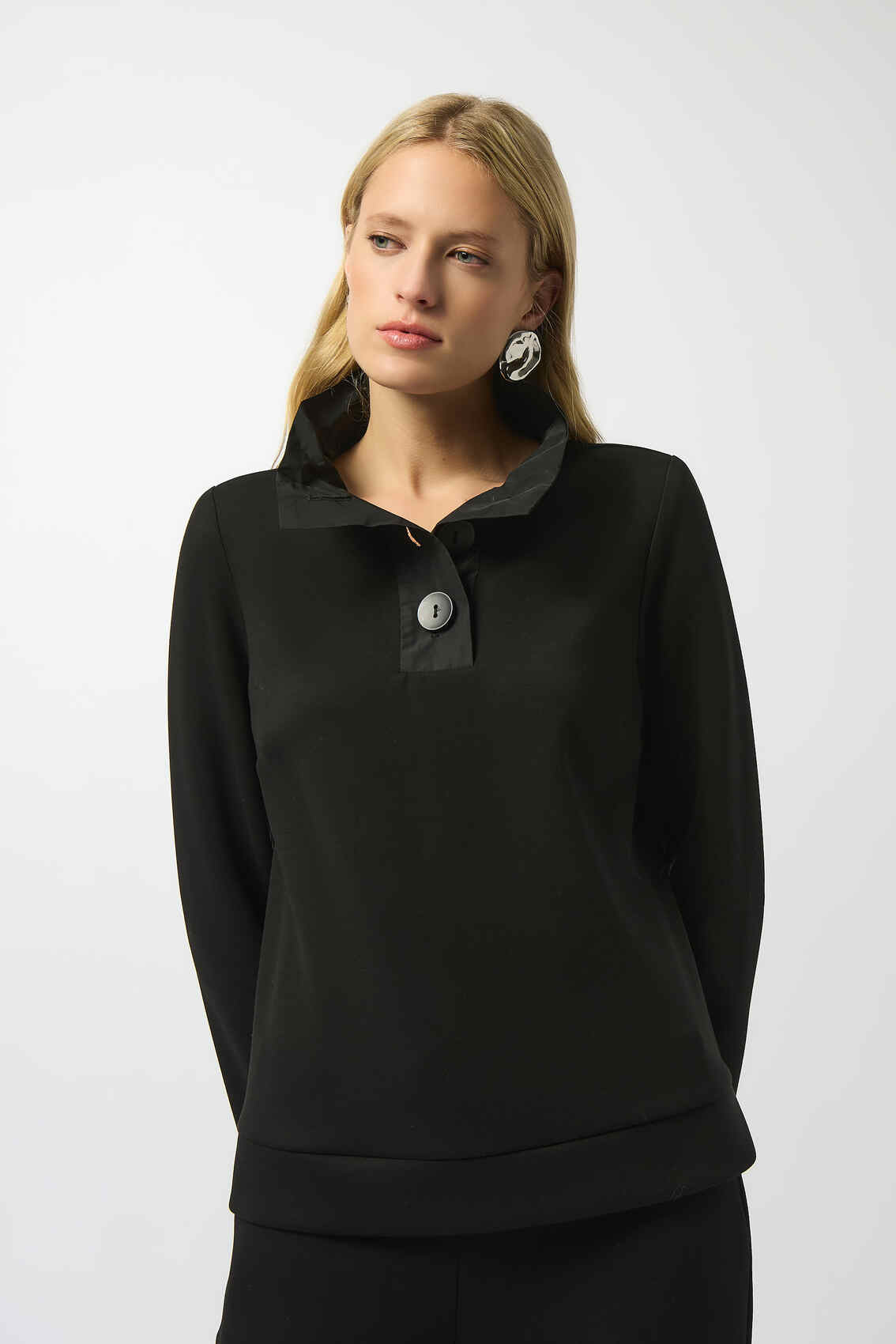Embrace the unparalleled style of this scuba jersey top. The piece boasts a funnel collar with sleek placket detail and long straight sleeves, that create a perfectly chic look. The boxy silhouette, adorned with a front button closure, captures the essence of contemporary flair.  Complete the look with matching trousers style 253136.