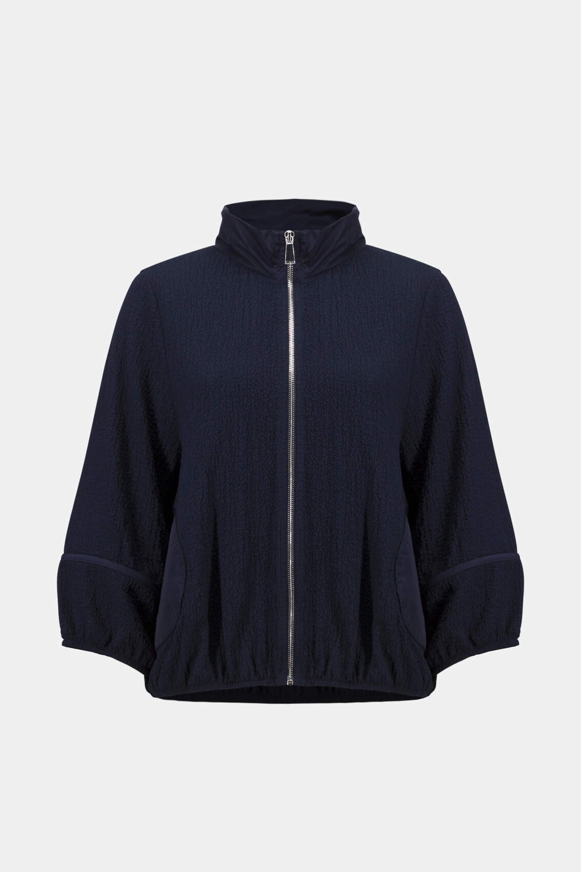 A fresh take on sporty structure, this cocoon-shaped bomber jacket combines crisp seersucker and memory fabrics with voluminous lantern sleeves, a funnel collar, and a clean zip-front finish. Complete the look with matching trousers style 261062.