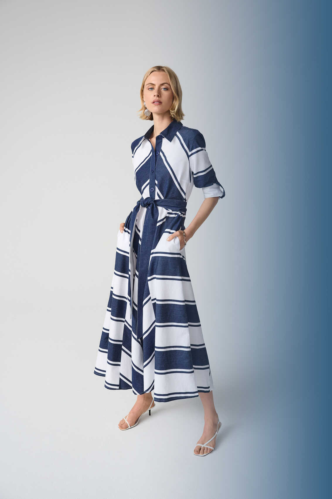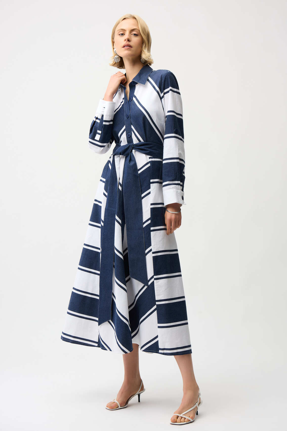 This stripe cotton shirt dress features a classic shirt collar and front placket with buttons. Three-quarter sleeves with tabs and a reversible solid sash at the waist add versatility, while the midi length completes the look.