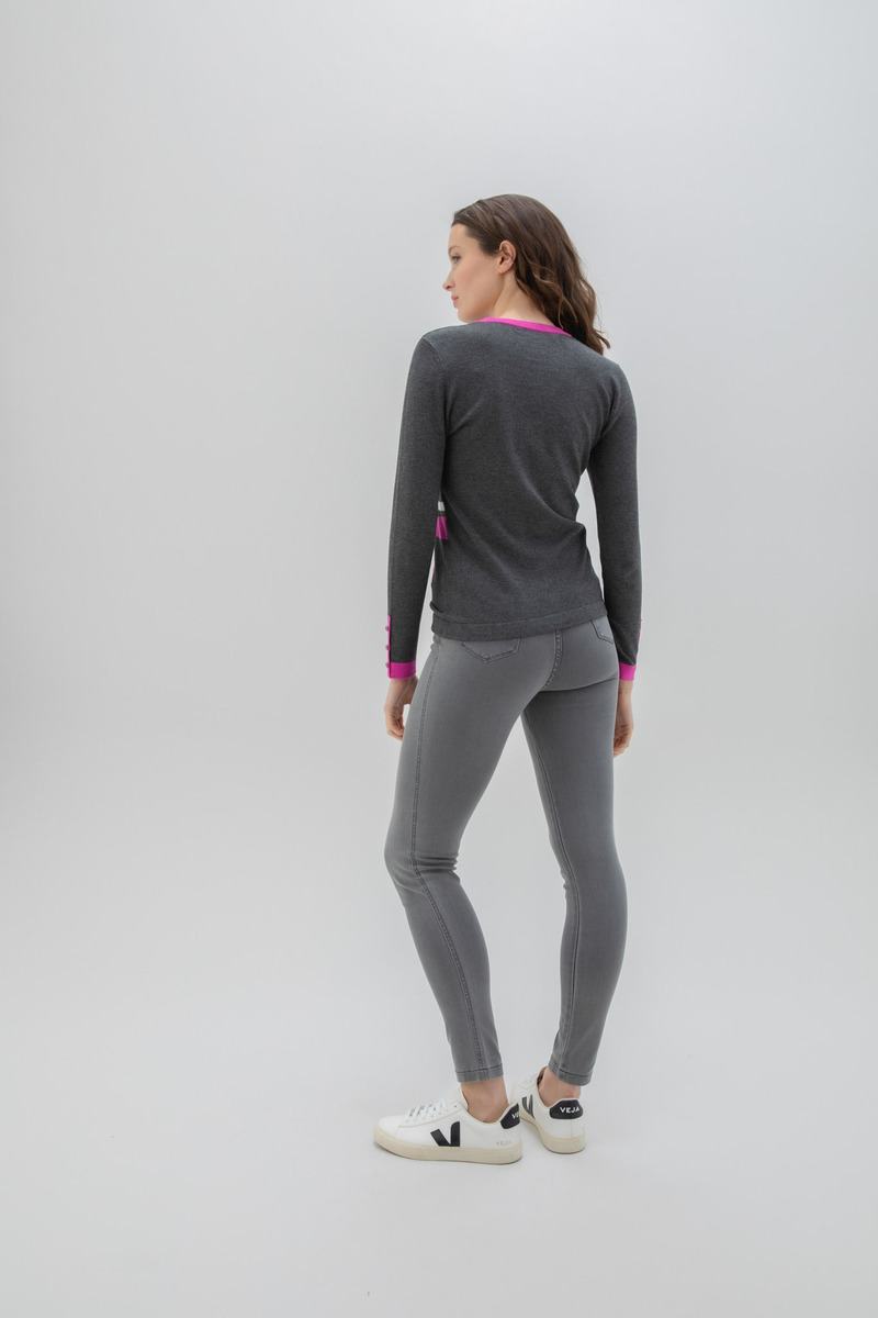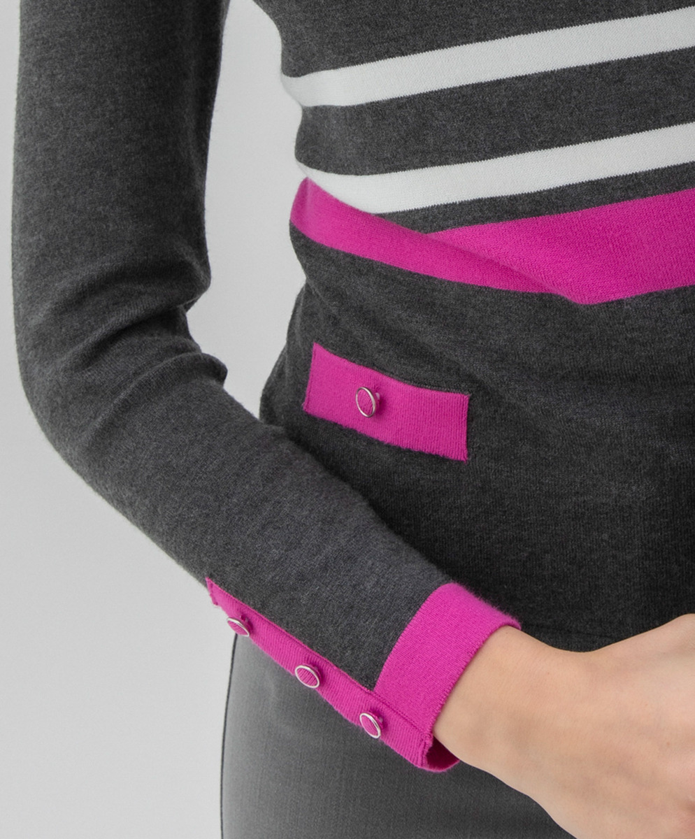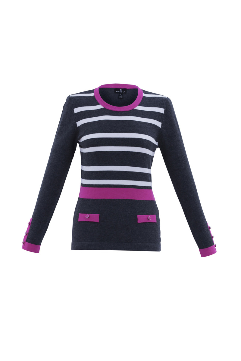 Super soft viscose mix scoop neck three colour sweater with covered button detail.