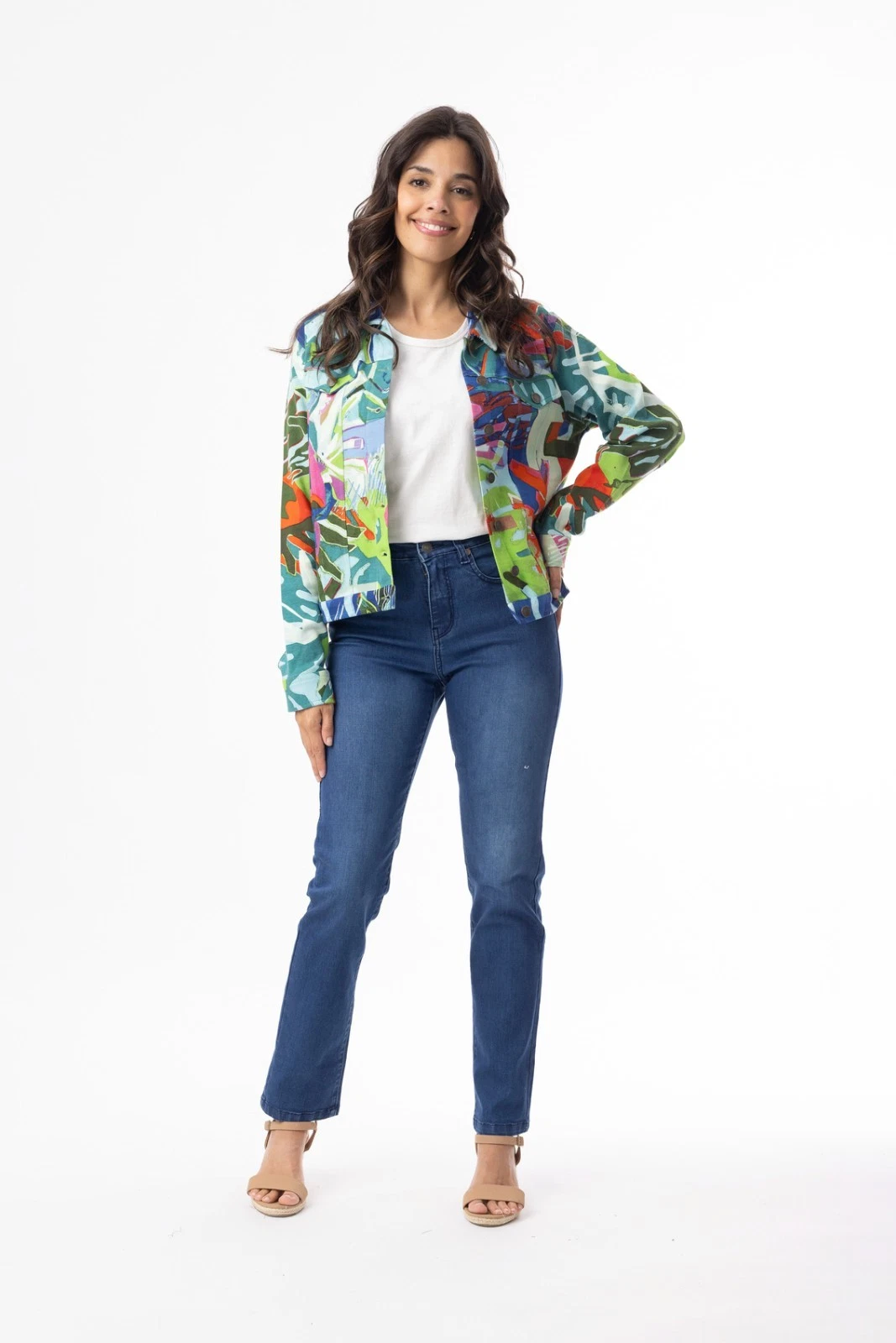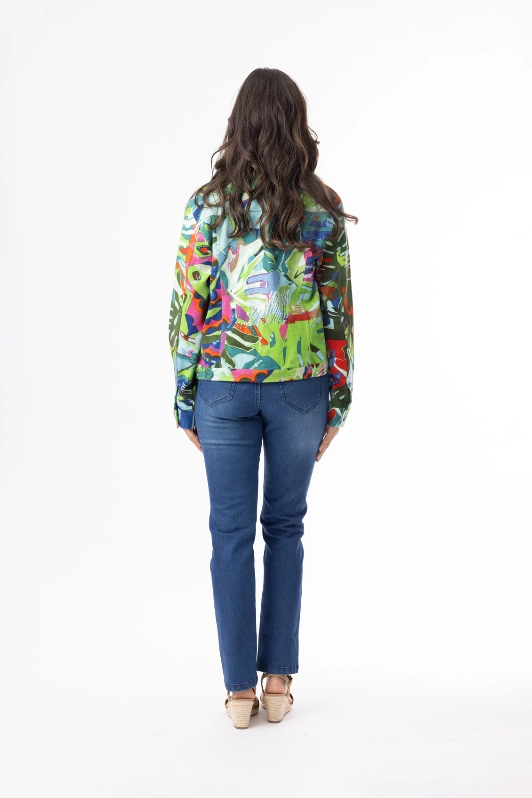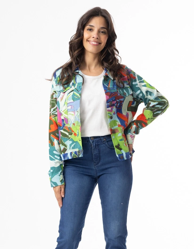 The Multi Print Leaves Blue Ponte Jacket is a playful essential that adds color and charm to any look. Made from a soft cotton-spandex blend, it offers comfort with just the right amount of stretch. Designed with a button-through front and a slightly cropped length, it creates a flattering, feminine fit. Finished in vibrant prints, this jacket is a standout piece that effortlessly elevates your style.