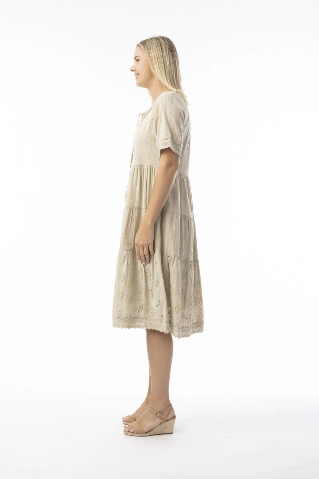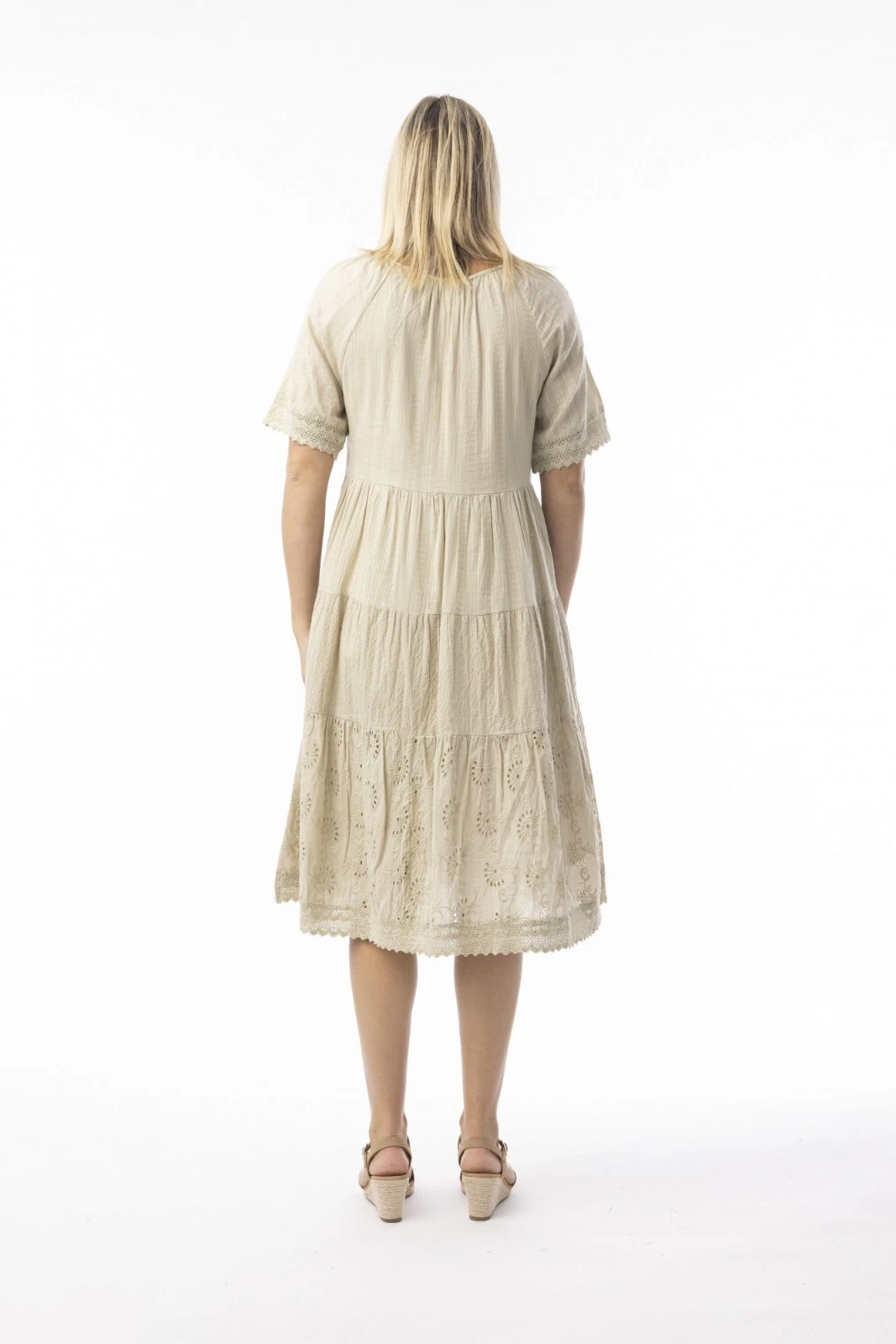 Soak up the sun in style with our stunning Essentials Broderie Layer Dress. Featuring short sleeves and a broderie neckline panel with tassel details, this dress is adorned with delicate accents of refinement. The gathered tiered skirt adds a touch of playful sophistication, making it perfect for any summer occasion. Colours may vary from the photos.