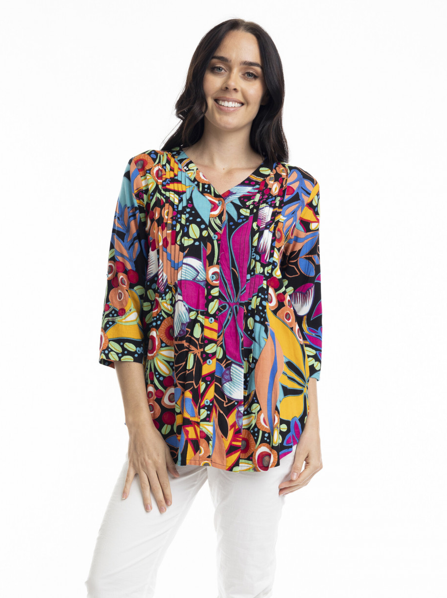 Step into style with our Copacabana top, the perfect addition to your summer wardrobe. Featuring a flattering v-neckline, delicate pleats at the bust, and practical 3/4 sleeves, this piece promises both comfort and elegance. This is the perfect piece for sunny, seaside days.