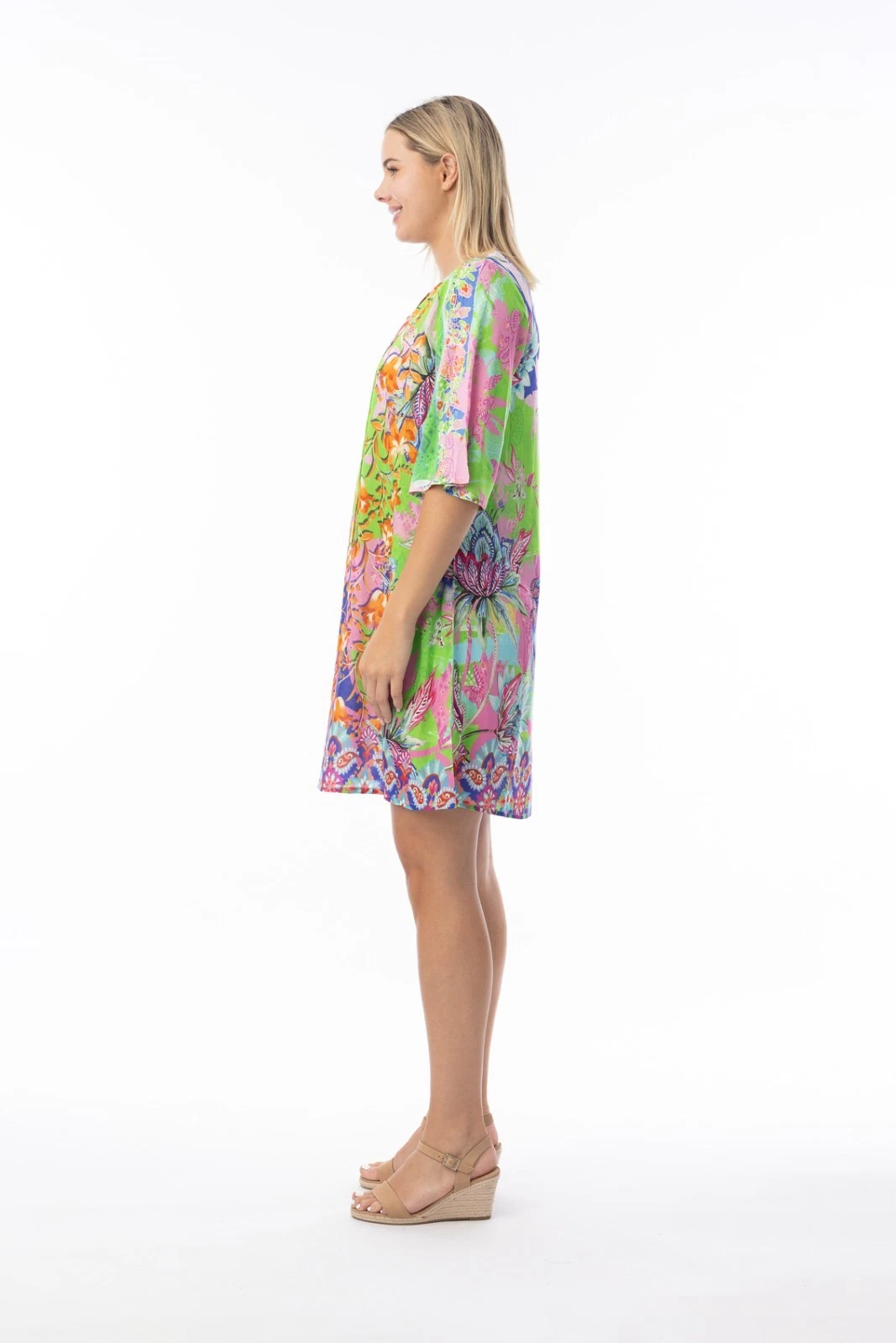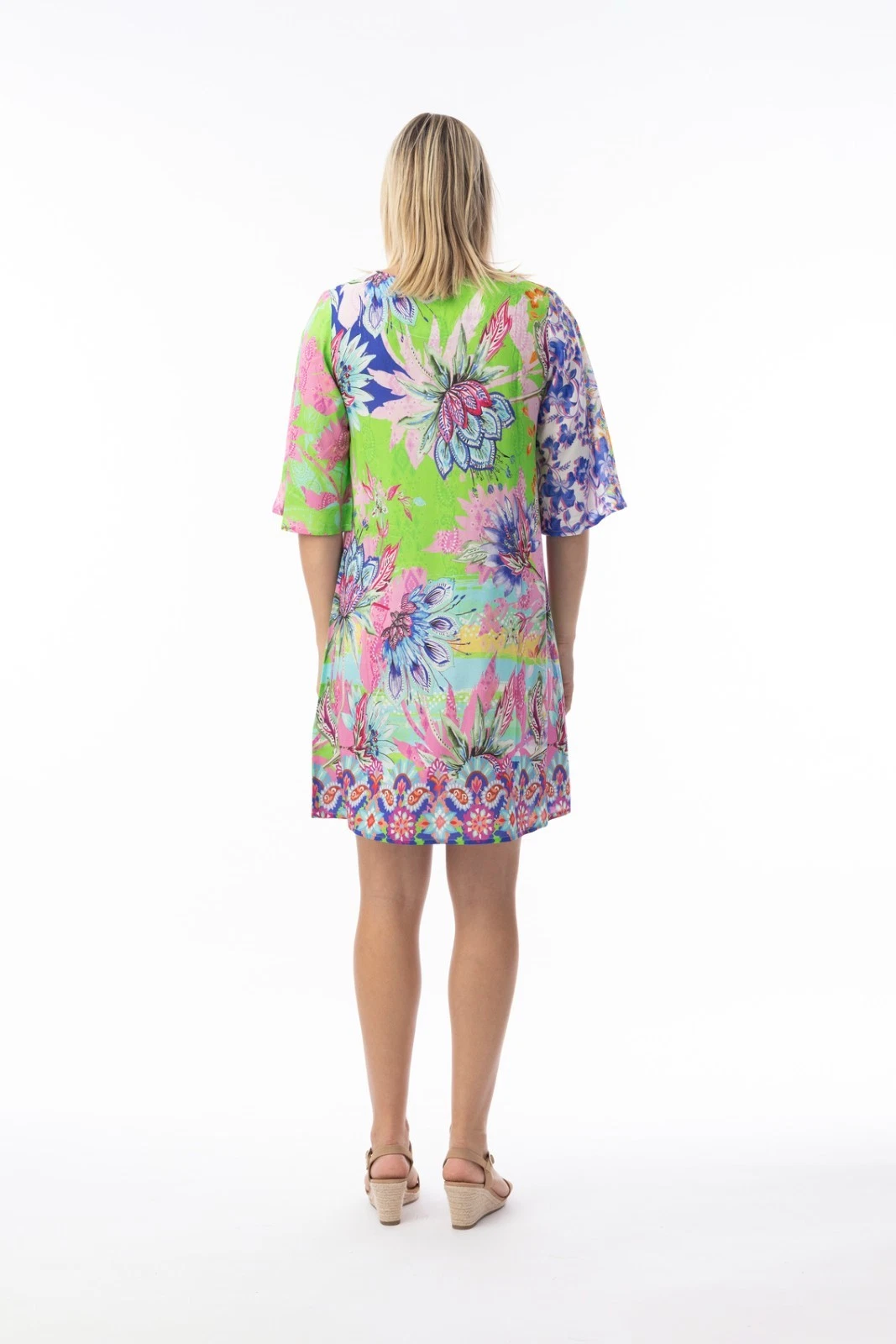 Turn heads under the sun in our stunning Digital Dress Tie. Perfect for beach holidays, this lightweight, colourful piece promises comfort and style featuring a relaxed silhouette, open neckline with tassel ties, drop-waist, knee-length skirt, and three-quarter sleeves. Ideal for soaking up the sun by the beach, this is your go-to for effortless elegance.