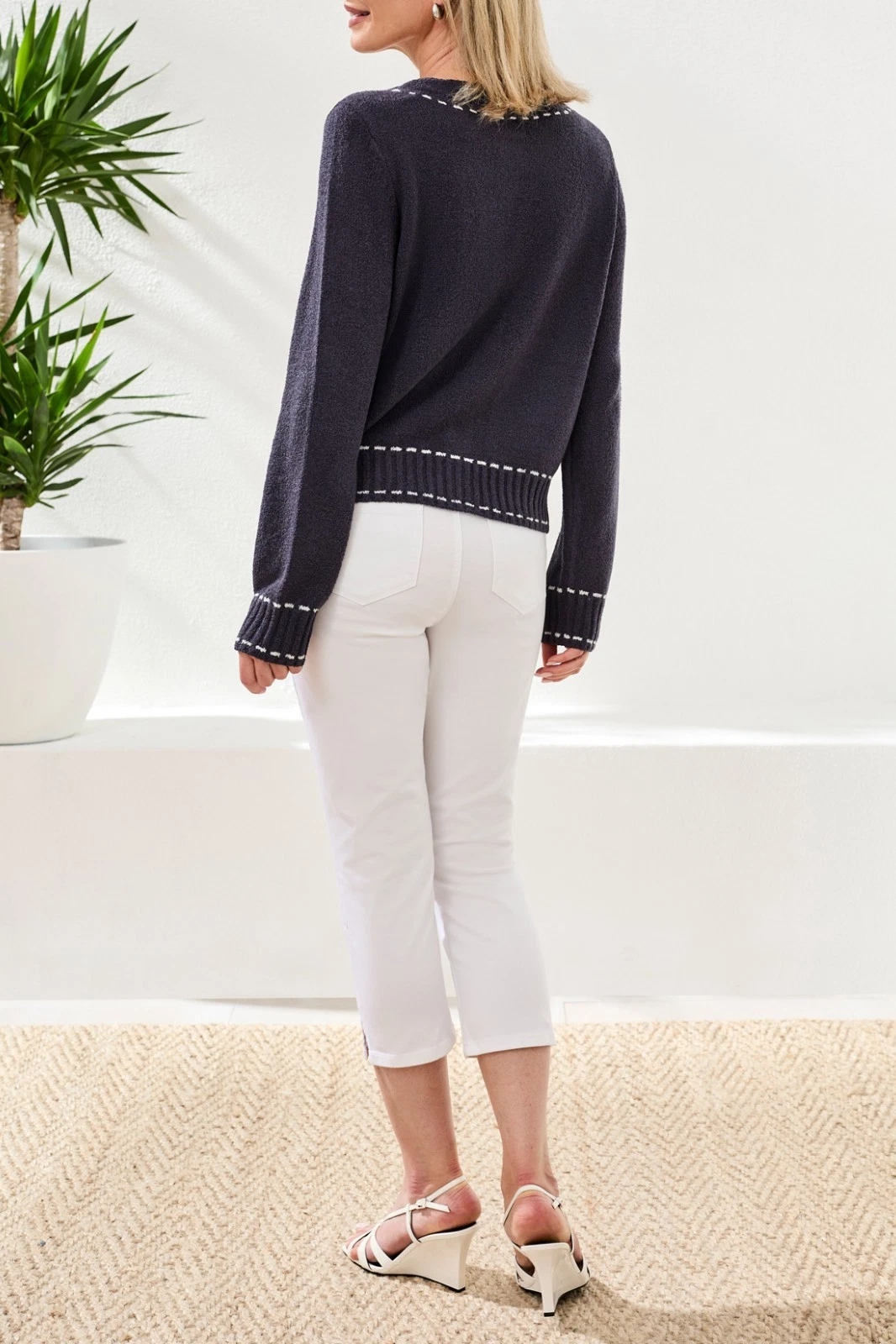 Enjoy the soft texture and easy layering of this boucle yarn cardigan, designed with long sleeves and a round neckline. A button-front closure and contrast stitch detailing add polished charm, while front flap patch pockets provide functional appeal.